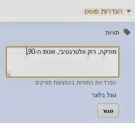 - בעת כתיבת רשומה (פוסט) מצד שמאל מופיעות הגדרות הפוסט, נלחץ על תוויות, נקליד את התוויות המשייכות את הפוסט הספציפי ונפריד ע"י פסיק. בכל עת נוכל ליצור תוויות נוספות או לסמן תוויות שנכתבה ולמחוק אותה. אפשרות זו נועדה לפוסט בודד.